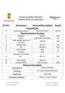 فاقد رطوبت و اسیدهای ترانس و حاوی ویتامین A و سایر ویتامینهای محلول در چربی نظیر D و E، همچنین امگا ۳.